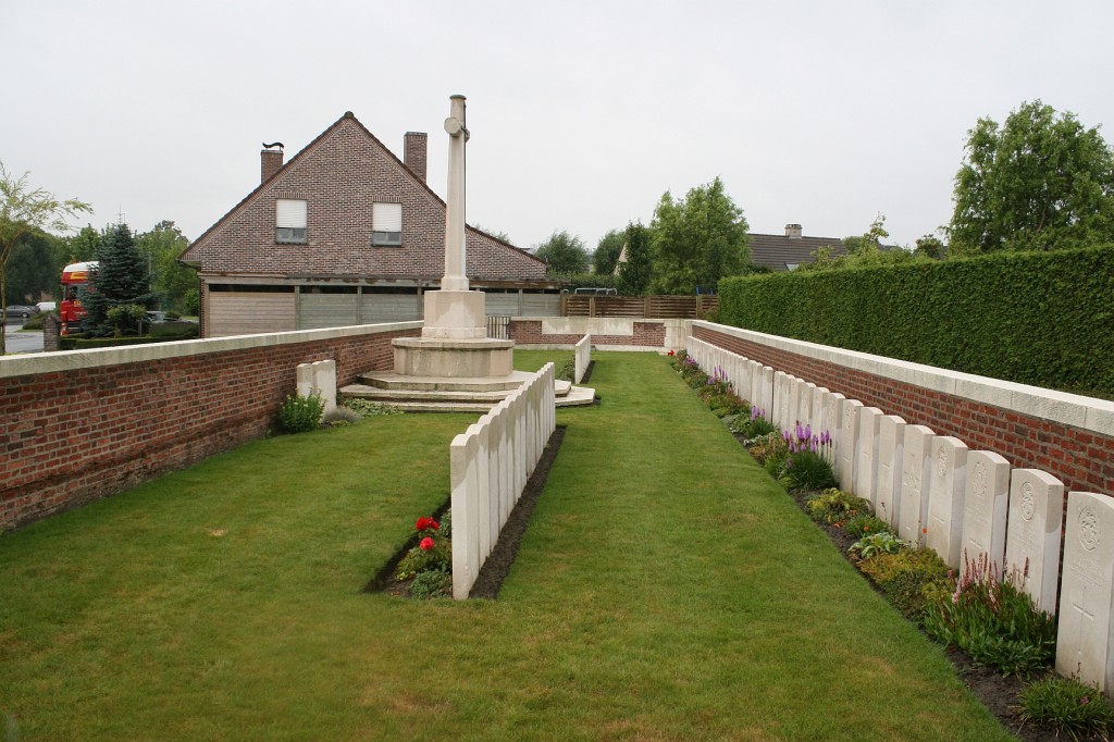 Maybe it’s appropriate that houses now surround this little cemetery; throughout the Battle of Courtrai, as the actions between 14th & 19th October 1918 became known, the British advance east took them through areas still inhabited by the local populace and fiercely defended by the Germans.