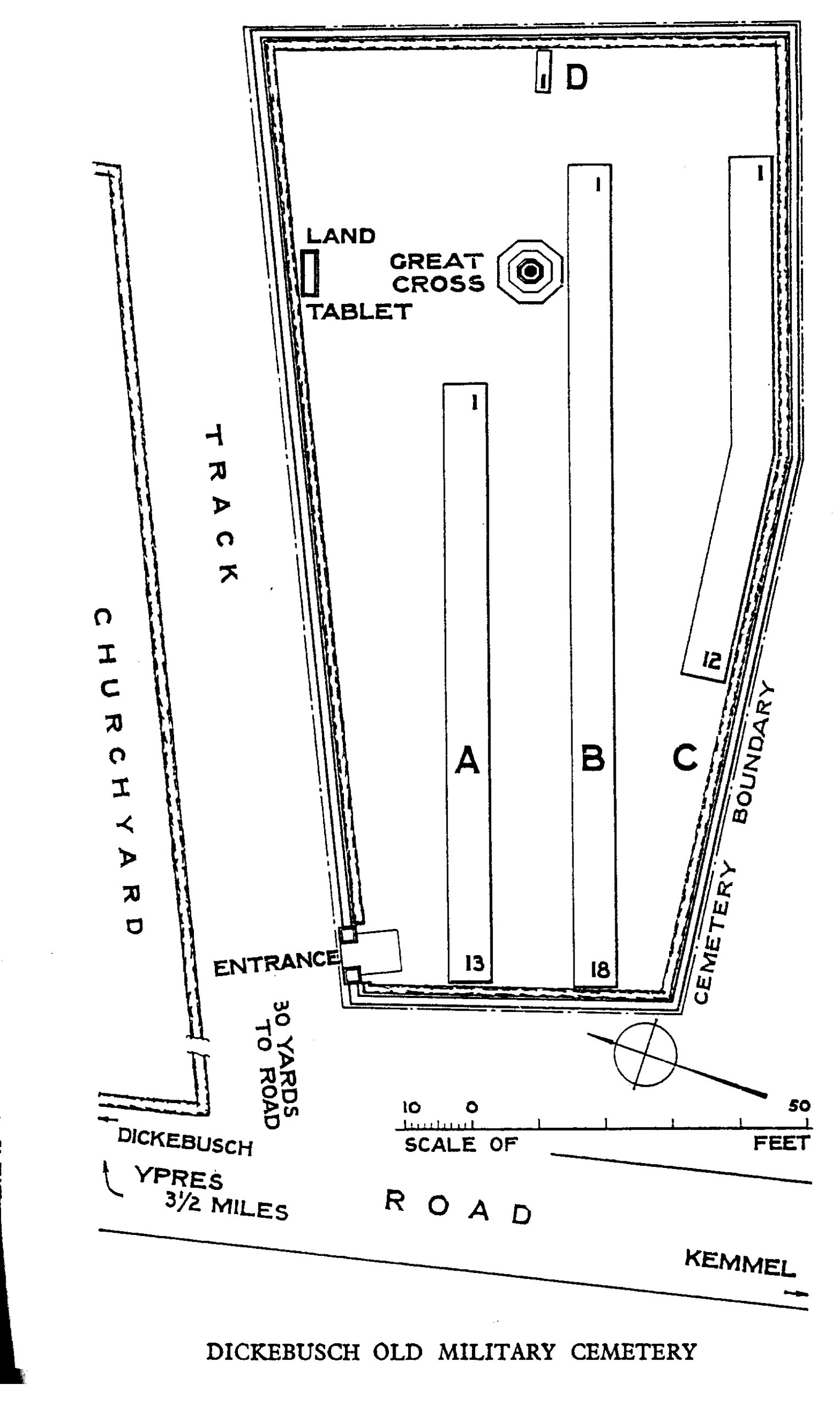 Dickebusch was around three miles behind the front lines throughout the war, and men killed or mortally wounded in the front lines were brought back here for burial.